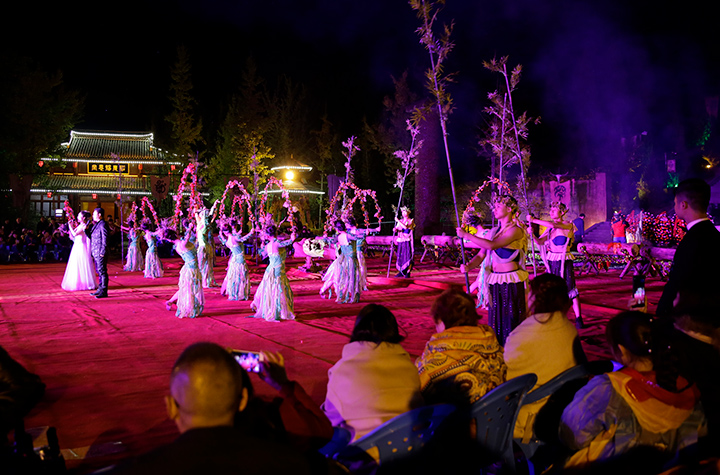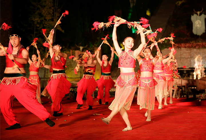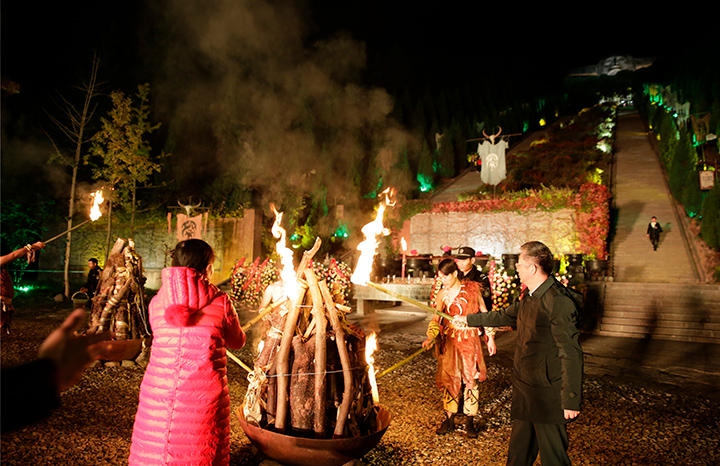 主持人随机挑选的四名嘉宾手持火把,点燃了舞台后方的三堆篝火,同时也点燃了现场嘉宾们的热情,篝火晚会正式拉开序幕。